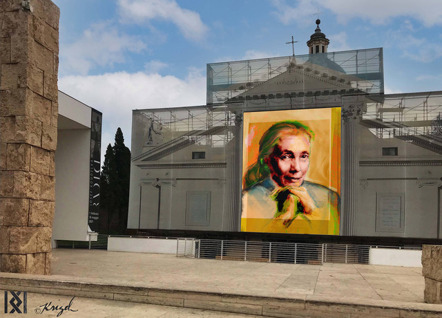 « This is a funny question because I have imagined exactly that! I produced two photomontage images of my work on city walls in Rome, where I live. One was of Jane Goodall, a primatologist and environmental activist, projected on the church of San Rocco near the Ara Pacis. The other image was of performers Katherine Dunham, a dancer choreographer and anthropologist, and Hazel Scott, a groundbreaking classical and jazz musician who broke through the race barrier on television. I projected them on the central concert hall of the Auditorium Parco della Musica in Rome. I think the message for passers-by would be: “Who is she? I want to know her?”. »