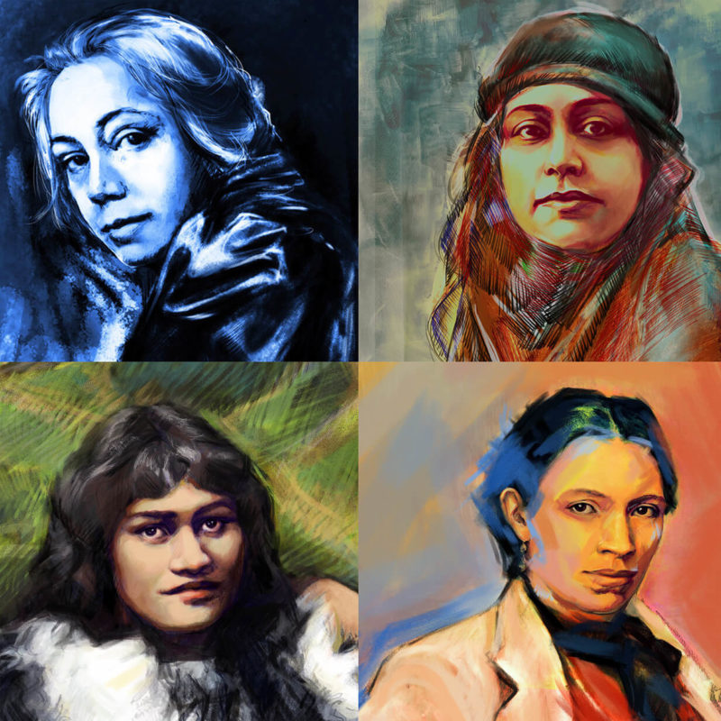 Clockwise starting upper left : Käthe Kollwitz, Huda Sha Awari, Te Puea Hērangi, Anita Garibaldi. © Katherine Krizek.